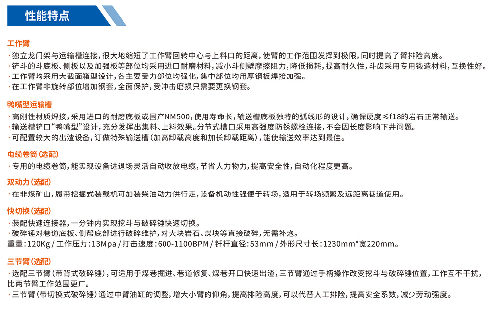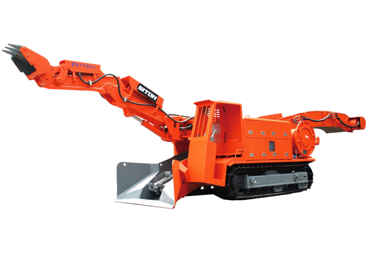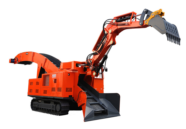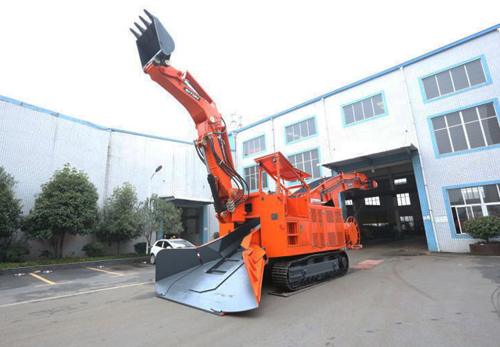 履帶挖掘式裝載機是一種連續(xù)生產(chǎn)的高效率出渣設(shè)備。主要用于鐵路、公路隧道及煤礦引水洞、國防洞窟掘進施工中裝載作業(yè)。本機靠履帶推進扒取巖石,通過反鏟機構(gòu)扒臂扒取遠處的巖石進自身的刮板輸送機,輸送機從尾部將巖石卸入自卸汽車、梭式礦車、側(cè)卸式礦車、皮帶機等其它轉(zhuǎn)載設(shè)備。