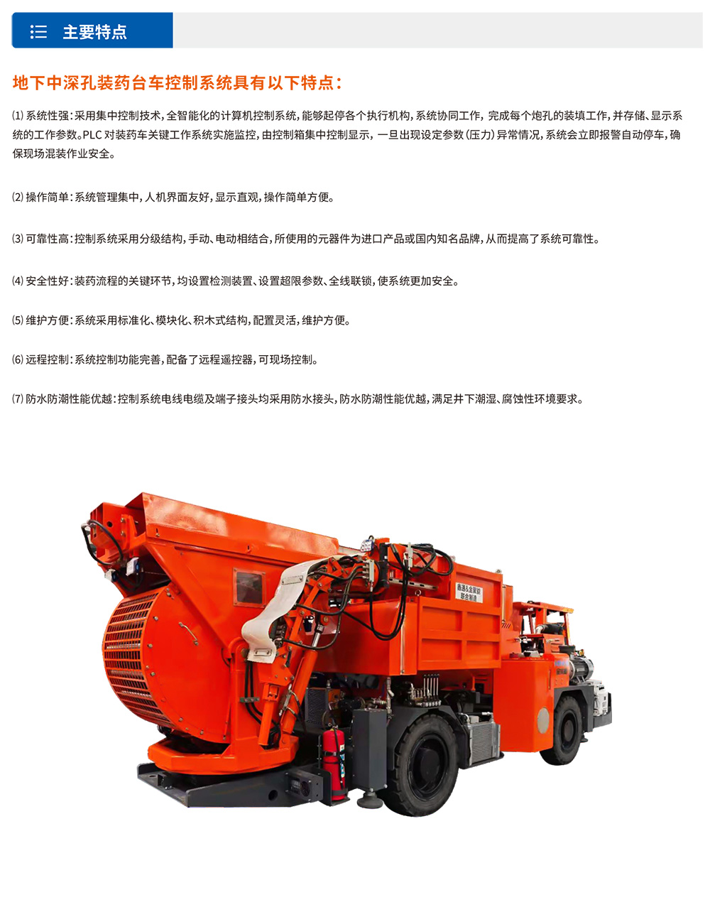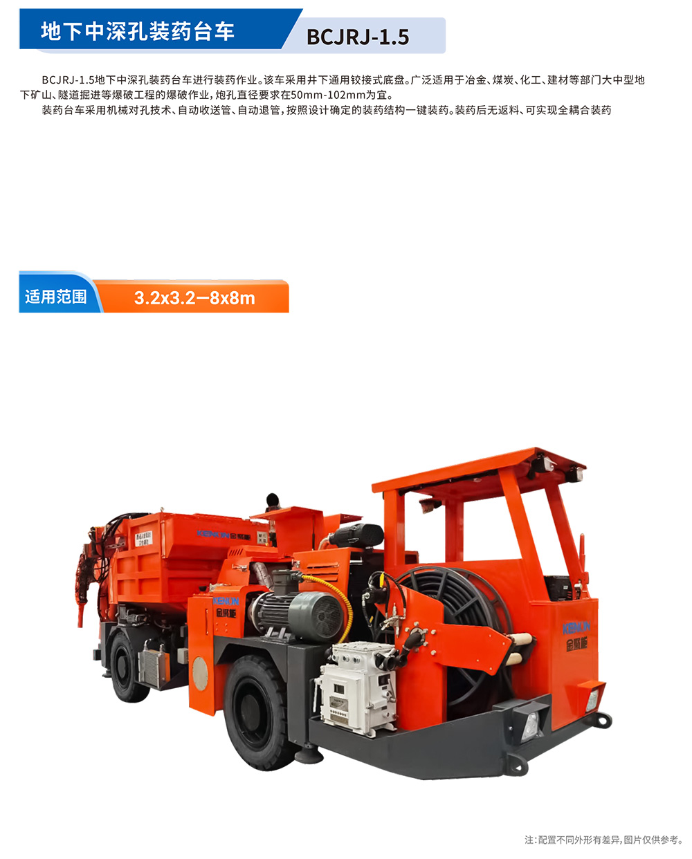 BCJRJ-1.5地下中深孔裝藥臺(tái)?進(jìn)?裝藥作業(yè)。該?采?井下通?鉸接式底盤。?泛適?于冶?、煤炭、化?、建材等部??中型地下礦?、隧道掘進(jìn)等爆破?程的爆破作業(yè),炮孔直徑要求在50mm-102mm為宜。裝藥臺(tái)?采?機(jī)械對(duì)孔技術(shù)、?動(dòng)收送管、?動(dòng)退管,按照設(shè)計(jì)確定的裝藥結(jié)構(gòu)?鍵裝藥。裝藥后?返料、可實(shí)現(xiàn)全耦合裝藥